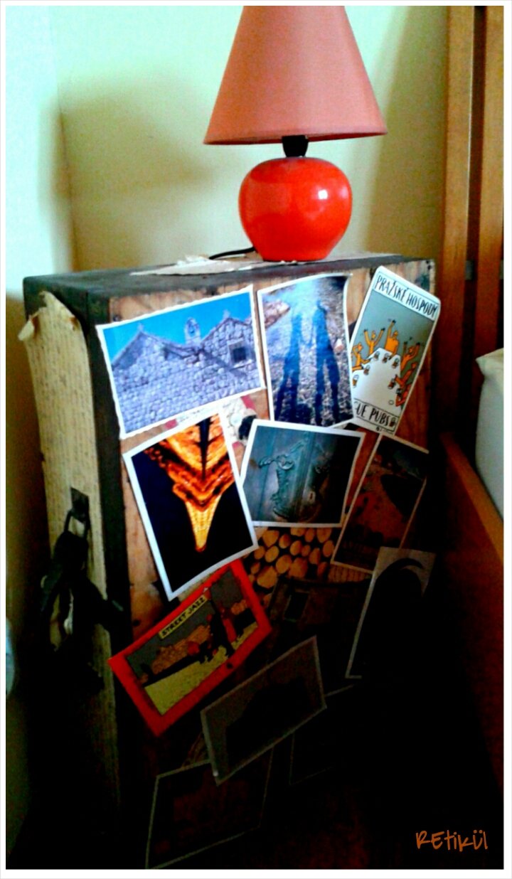 Letisztogattam..aztán az elejére fényképeket,képeslapokat ragasztottam…gyurma ragasztóval,hogy ha kedvem tartja újakkal díszítsem.Az oldalát régi írásos csomagoló papírral vontam be.