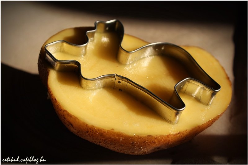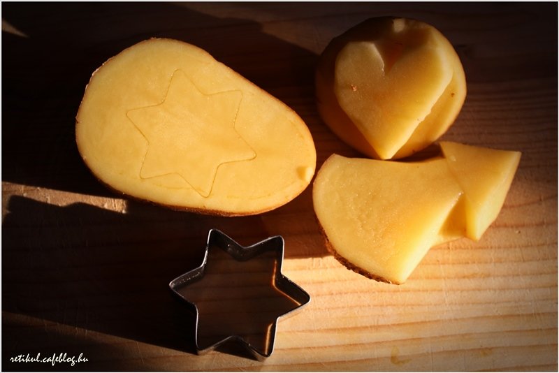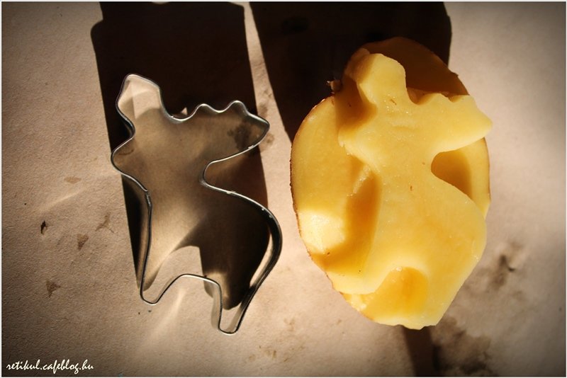 1.Félbevágjuk a krumplinkat és beleszúrjuk jó mélyen a kiszúró formánkat.