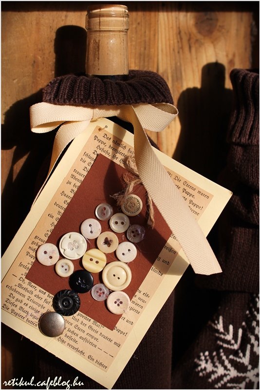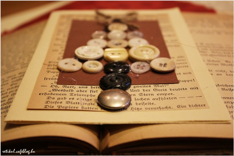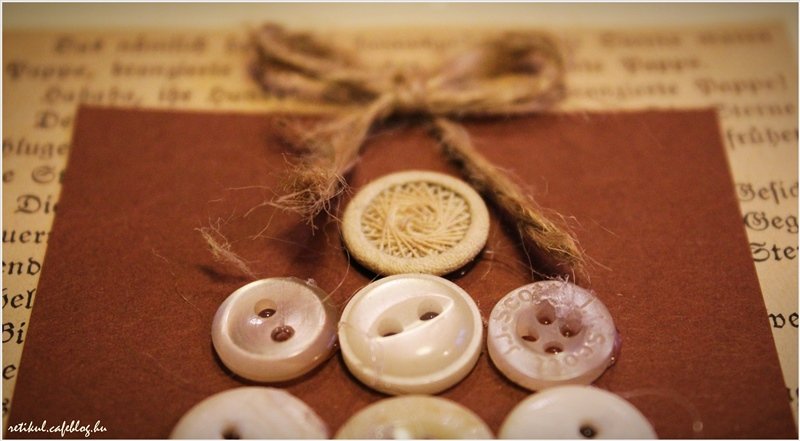 Az alapot kivágva,egymásra ragasztottam a különböző papírokat,a gombokat és a spárga masnit ragasztópisztollyal rögzítettem.