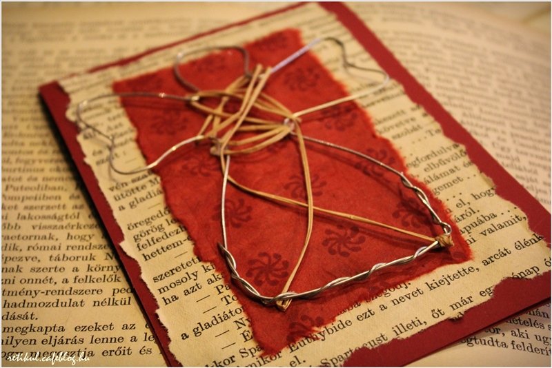 Könnyen hajlítható drótból,sematikus angyal formát hajlítottam,raffiával ‘öltöztettem’.