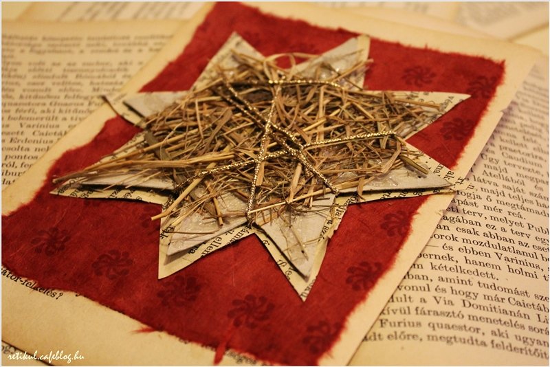 A szénát felvágva apró darabkákra,csillag alapra ragasztva,arany cérnával átkötözve.