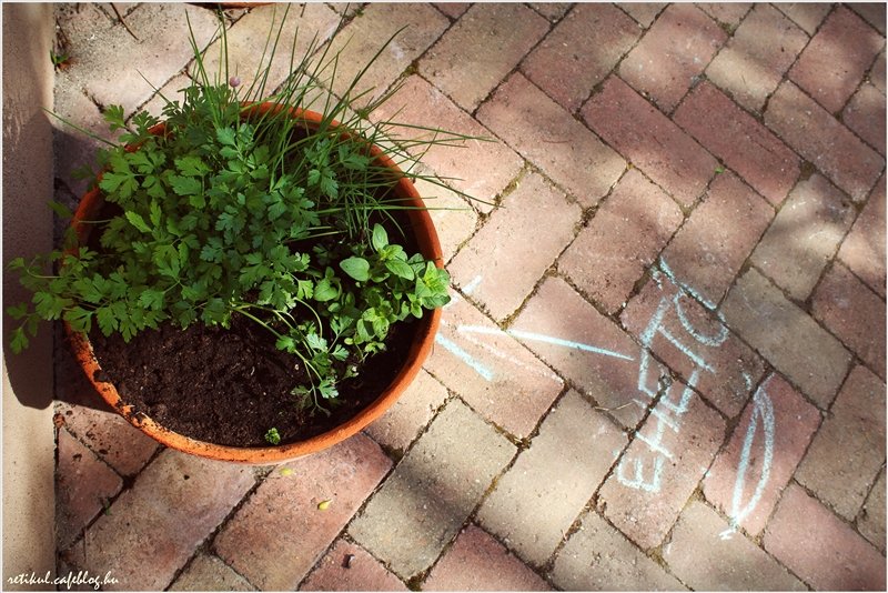 Két óriás cserépbe fűszernövényeket ültettünk.