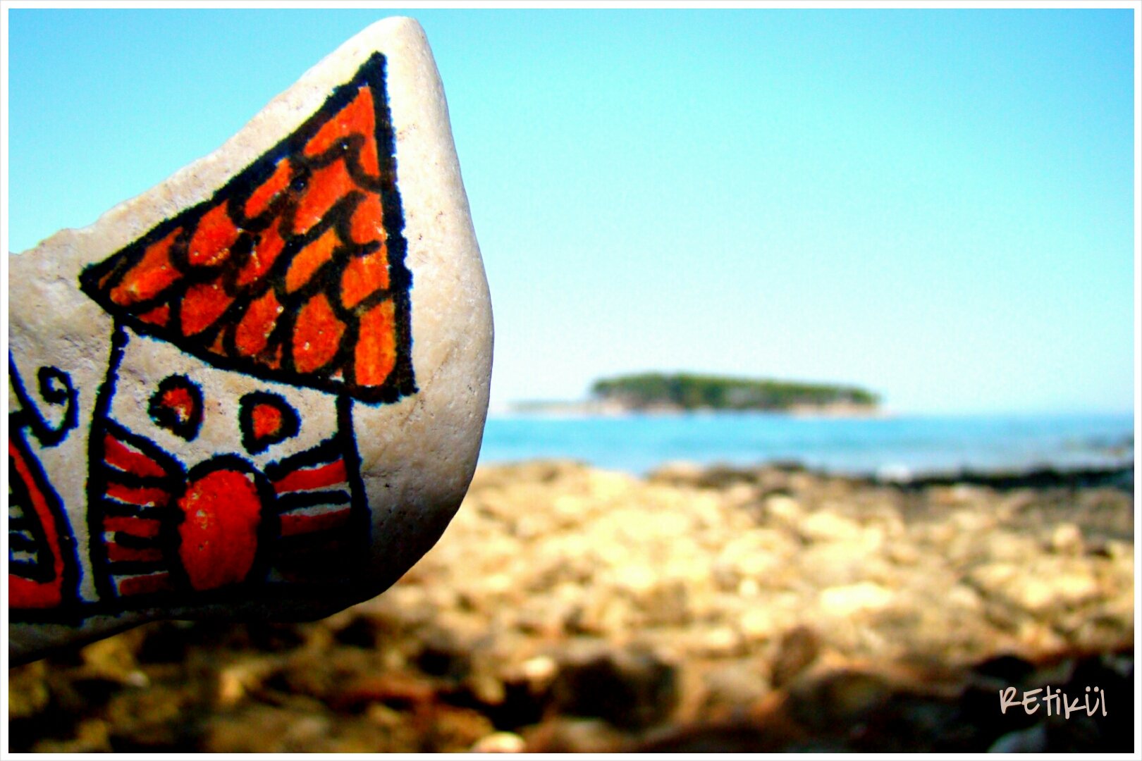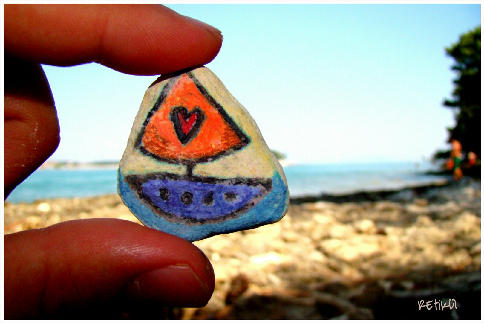 Az első köveknél(jobb híján) sima filctollat használtunk.Mivel a nyaralás tervezésekor nem gondoltam előre,arra,hogy kövekre fogunk rajzolni.De volt nálam átlátszó körömlakk,így azzal valamelyest tudtuk rögzíteni a rajzolt mintát.Nem a legtökéletesebb megoldás,mert idővel(főleg,ha játszunk is velük) el kezd kopni.