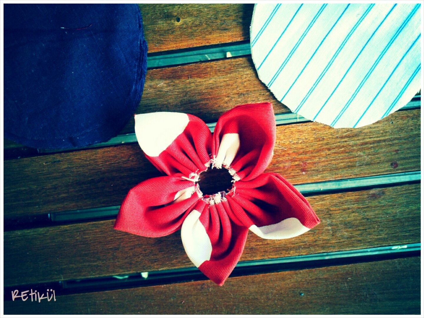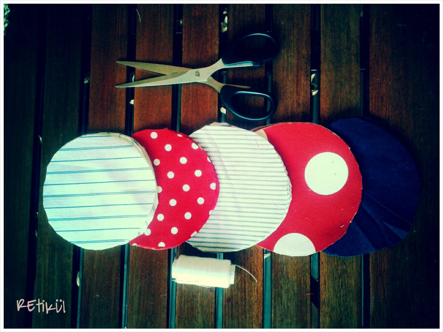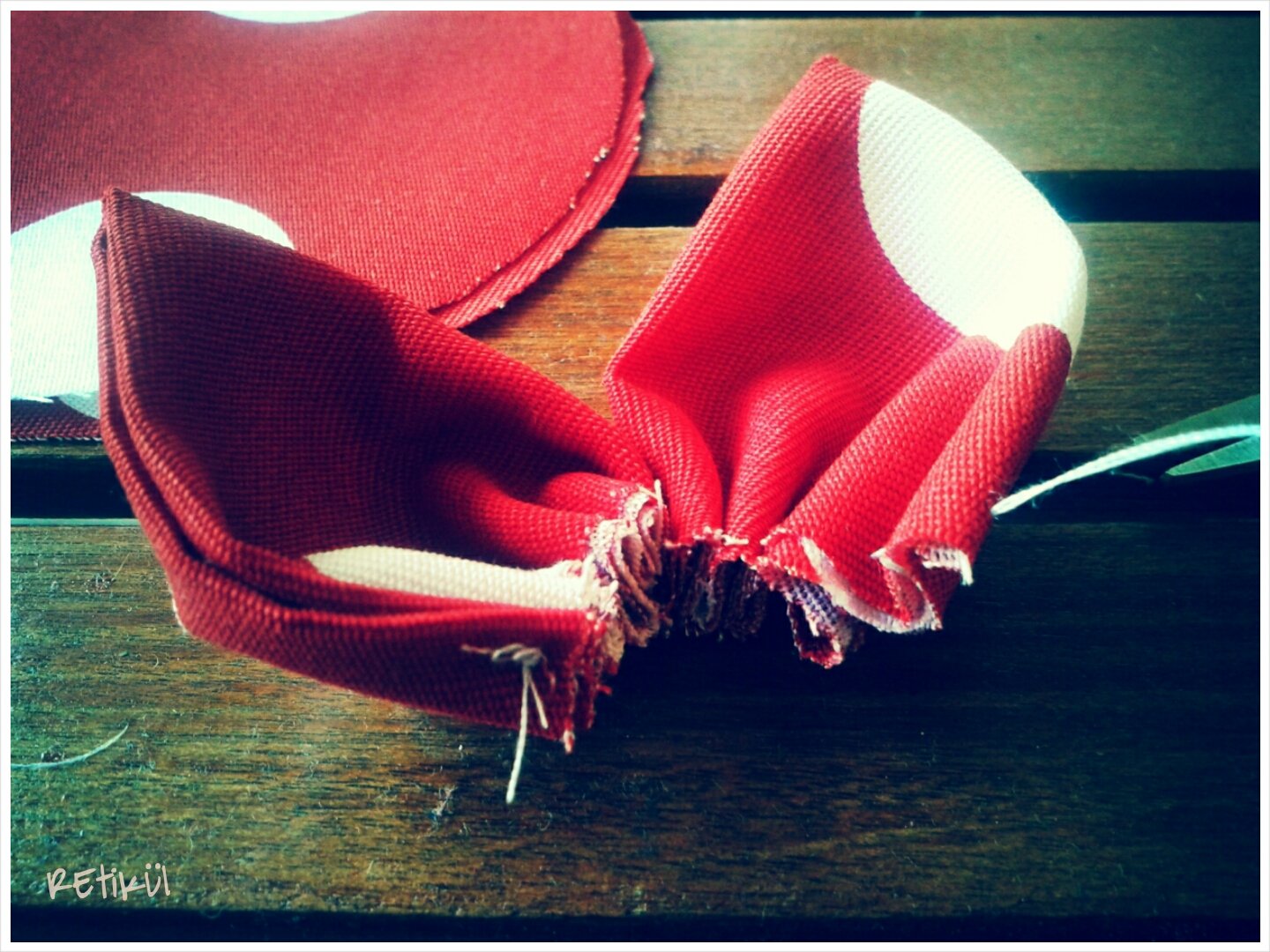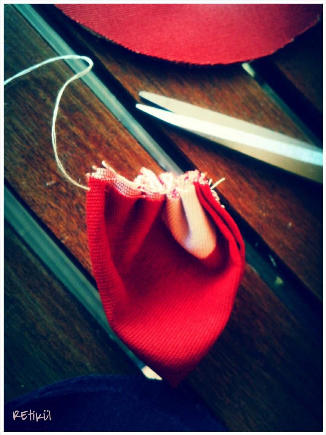 3.Az íves felén behúzzuk,kis öltésekkel.Olyan hosszú cérnát vágjunk,hogy mind az öt szirom ráférjen.