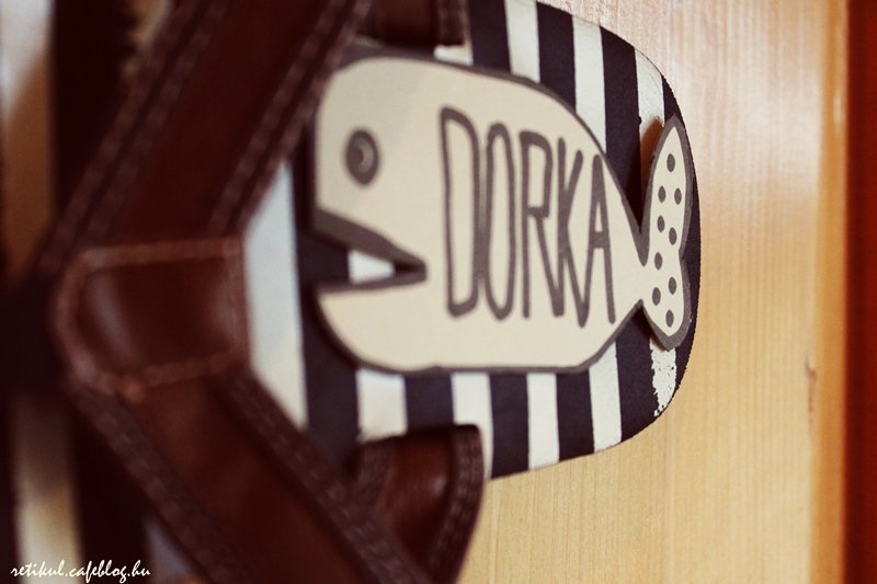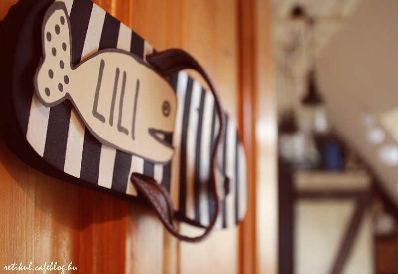 Kartonpapírt hal formára vágtam,ráírtam a lányok nevét bele ragasztottam(gyurmaragasztóval)a pacsker belsejébe.(Így akár még hordható is lesz,ha meguntuk névtáblának.)