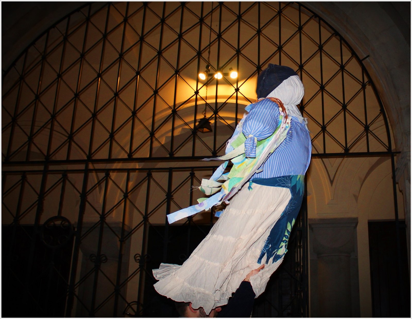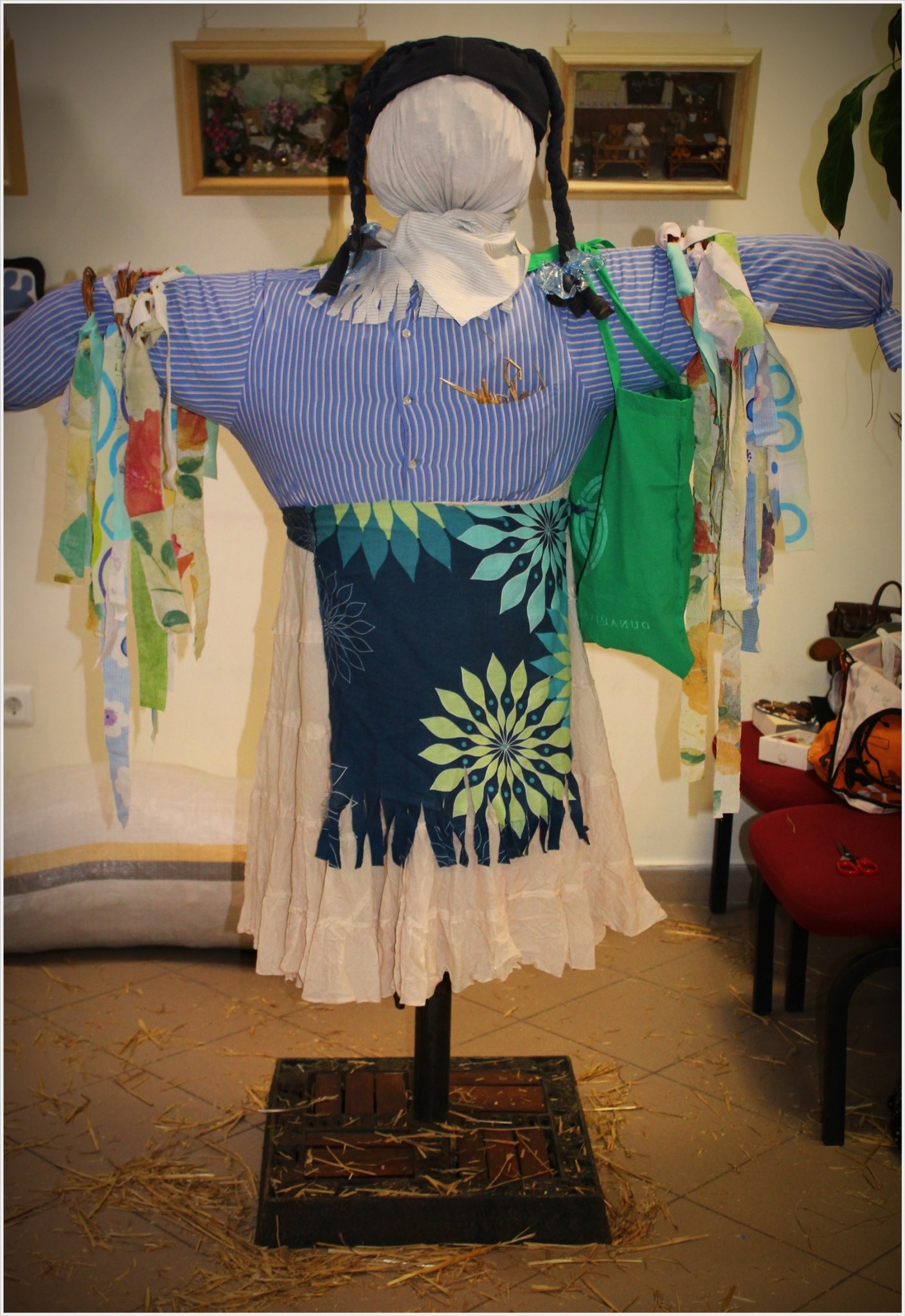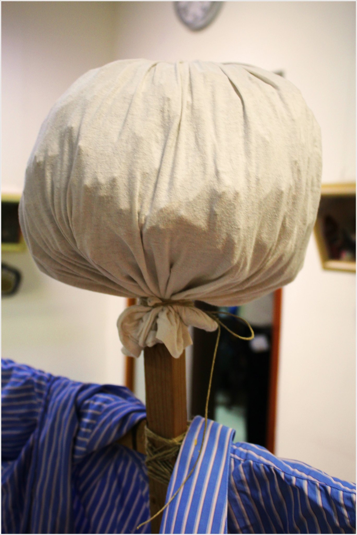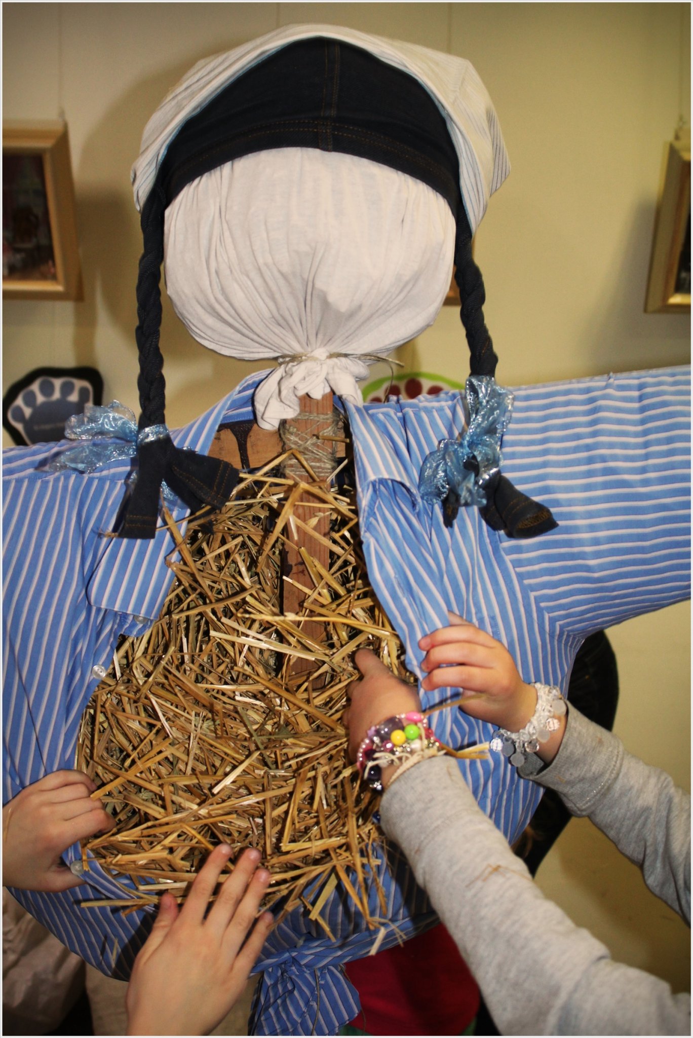 2.A feje kinyúlt trikóból készült.Elkötöttem az egyik felét,a gyerkőcök pedig ügyesen kitömték szalmával.