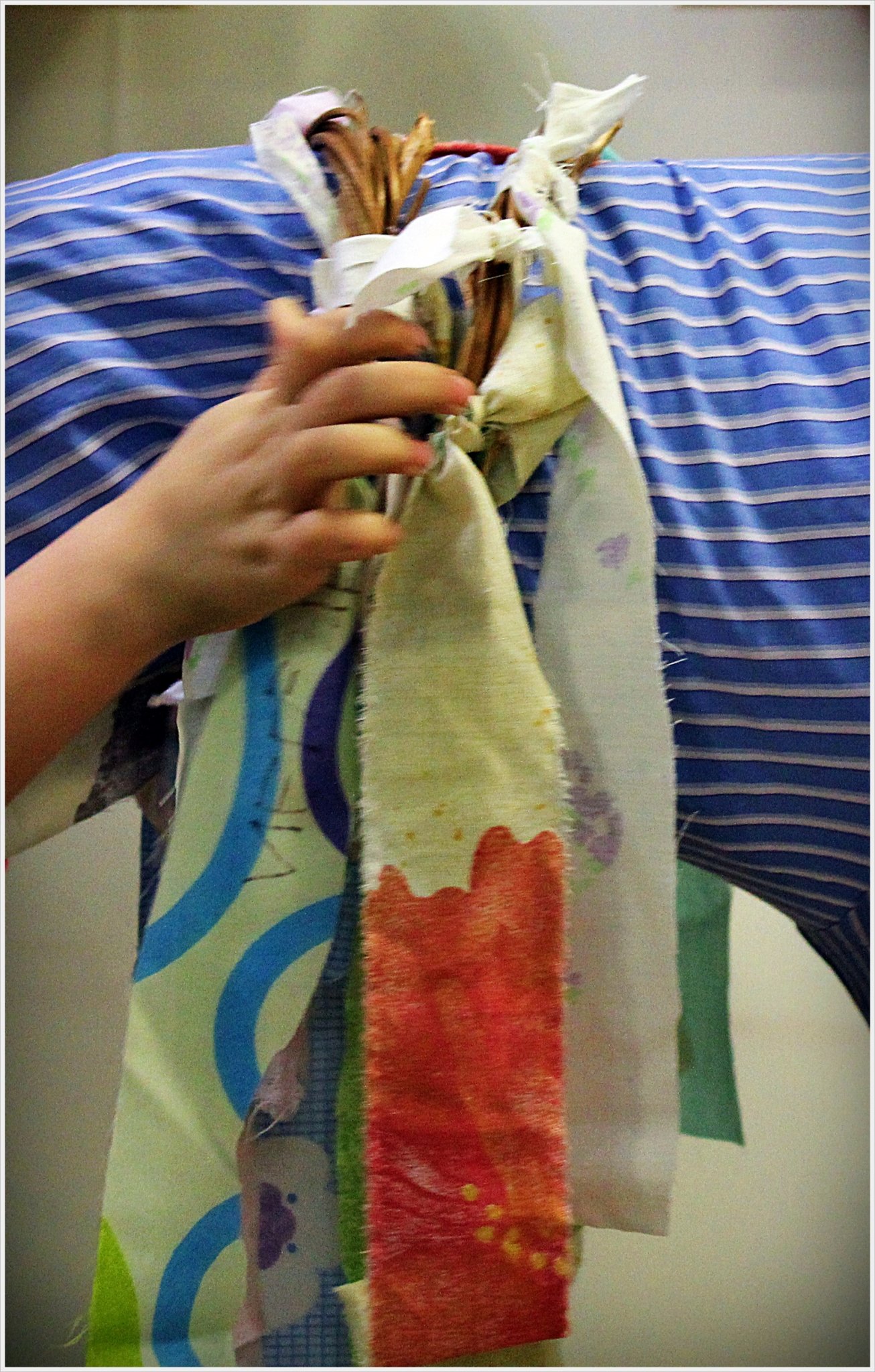 4.A törzse jól megtermett lett.Az ing ujjait elkötöttem csukló tájon és az alját is jól megkötöztem.Begomboltuk félig.A tömést a karokkal kezdtük,majd a pocak következett.Kicsi és nagy óriási elszántsággal gyömöszölte a picit szúrós szalmát.