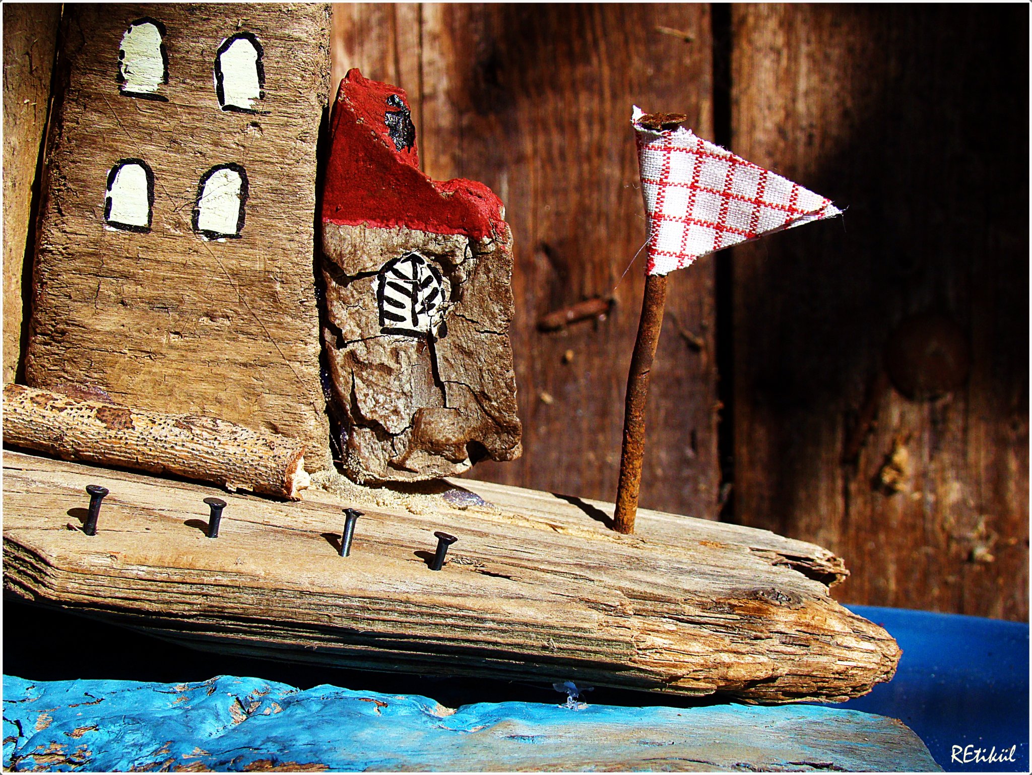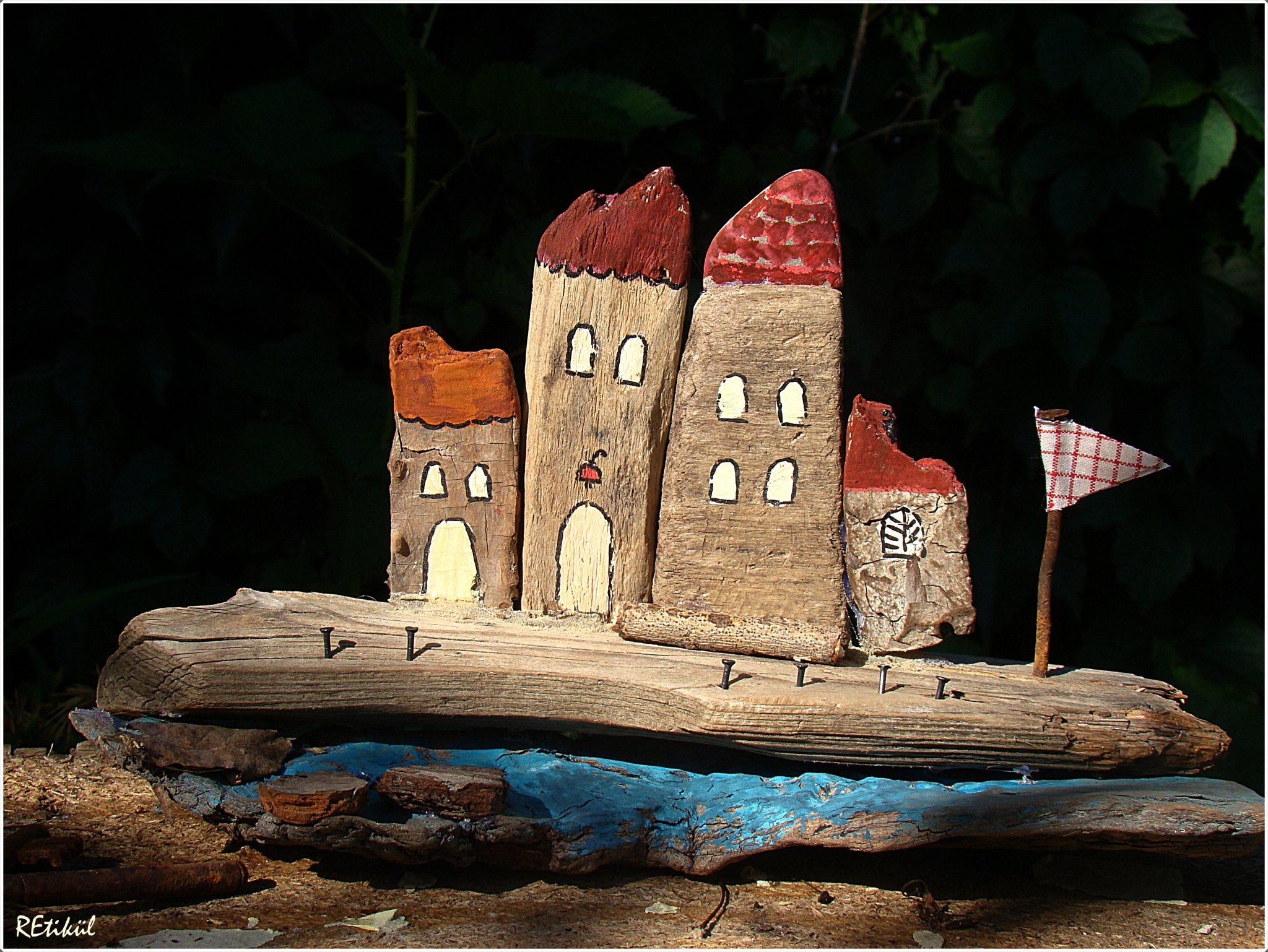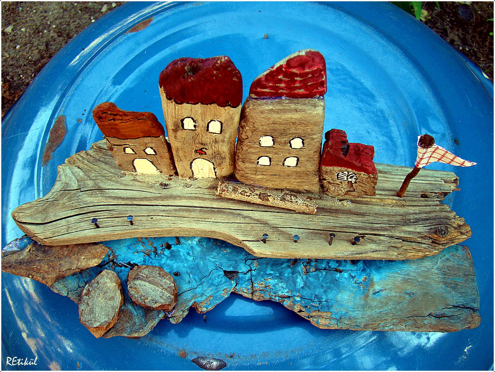 A legalulra kerülő uszadékfát is befestettem,kékre,kopottasan.