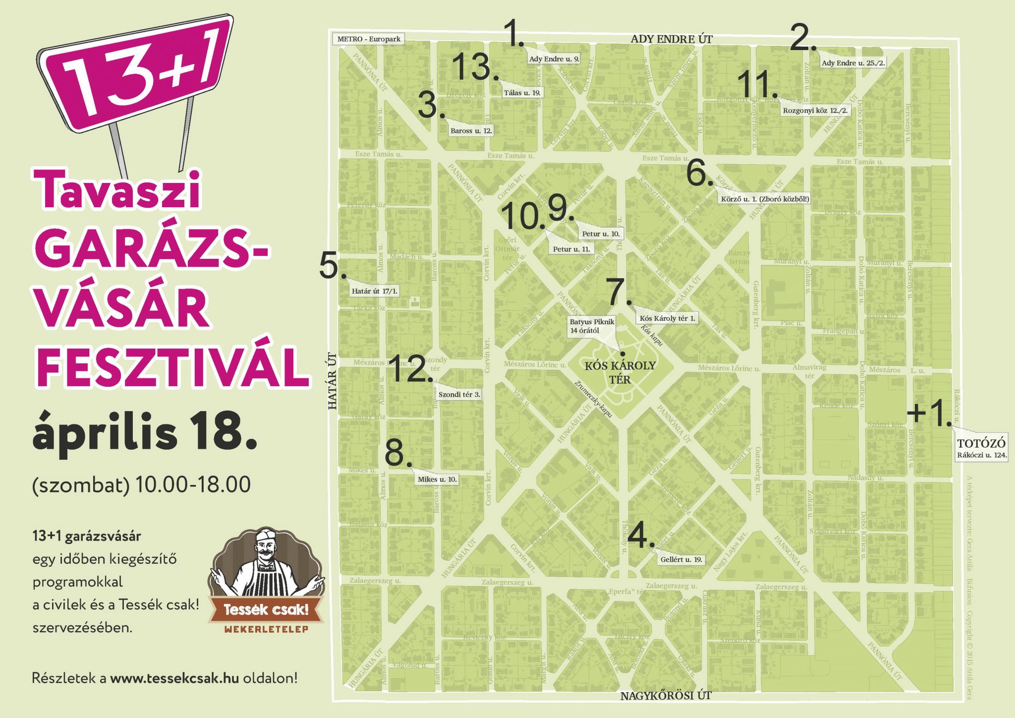„Hallottak már garázsvásárról? Hát a Wekerletelepről? És a kettő ötvözetéről? Mert ilyen is van! Wekerlei Garázsvásár Fesztivál! Április 18-án, szombaton, 10-18 óra között ugyanis immáron harmadik alkalommal rendezzük meg fesztiválunkat, melyen most 13+1 helyszínen várjuk az érdeklődőket! Szervezői a helyi civilek és a Tessék csak! program, utóbbiról bővebb tájékoztatás itt: (http://tessekcsak.hu/)